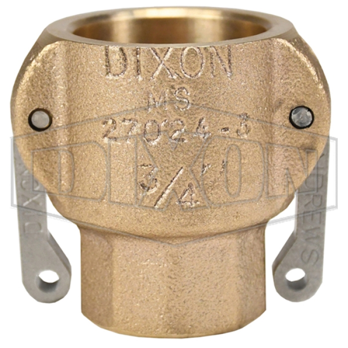 Dixon® Cam and Groove Type D Coupler, Connection Type 1: Fitting, Gender 1: Female, Connection Size 1: 3/4 in, Connection Type 2: NPT, Gender 2: Female, Connection Size 2: 3/4 in, Thread Size 2: 3/4-14, 250 psi, Brass, Dimensions: 1-5/8 in Dia x 2-1/32 in L