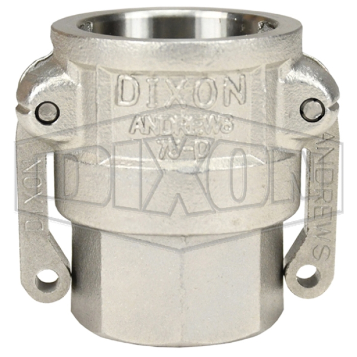 Dixon® Cam and Groove Type D Coupler, Connection Type 1: Fitting, Gender 1: Female, Connection Size 1: 3/4 in, Connection Type 2: NPT, Gender 2: Female, Connection Size 2: 3/4 in, Thread Size 2: 3/4-14, Hex Size: 1-5/16 in, 250 psi, 316 Stainless Steel, Dimensions: 1-5/8 in Dia x 2-1/16 in L