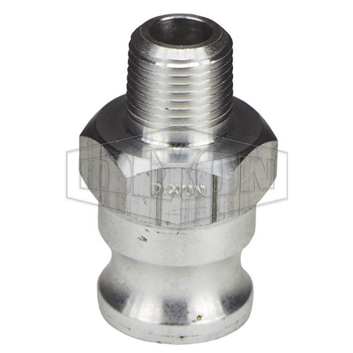 Dixon® Cam and Groove Type F Adapter, Connection Type 1: Fitting, Gender 1: Male, Connection Size 1: 3/4 in, Connection Type 2: NPT, Gender 2: Male, Connection Size 2: 1/2 in, Thread Size 2: 1/2-14, Hex Size: 1-5/16 in, 250 psi, Aluminum, Dimensions: 2-1/2 in L