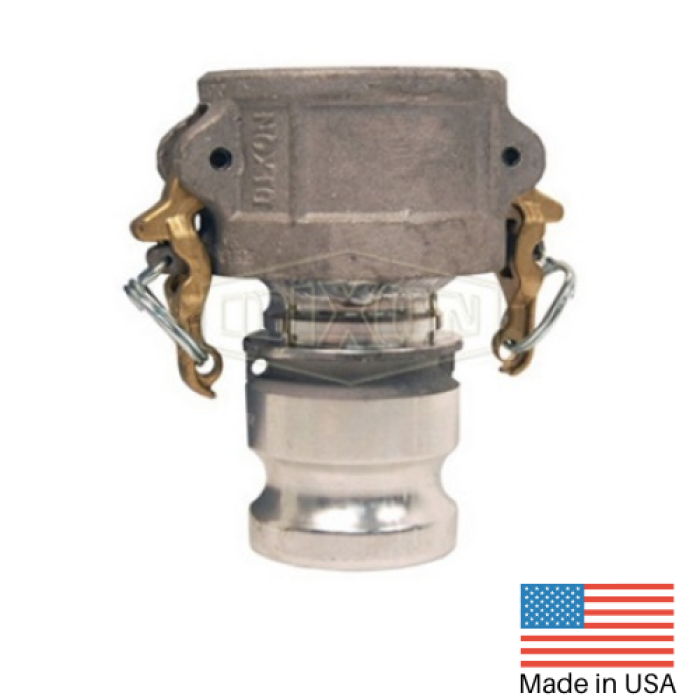 Dixon® Boss-Lock™ Cam and Groove Type DA Jump Size Coupling, Connection Type 1: Fitting, Gender 1: Female, Connection Size 1: 8 in, Connection Type 2: Fitting, Gender 2: Male, Connection Size 2: 6 in, 50 psi, Aluminum, Dimensions: 9-7/8 in Dia x 8-23/32 in L