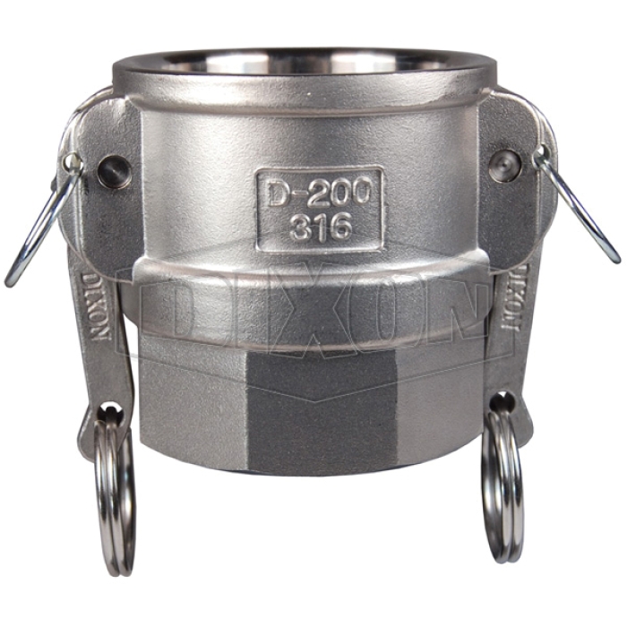 Dixon® Global Cam and Groove Type D Coupler, Connection Type 1: Fitting, Gender 1: Female, Connection Size 1: 1-1/4 in, Connection Type 2: NPT, Gender 2: Female, Connection Size 2: 1-1/4 in, Thread Size 2: 1-1/4-11-1/2, 250 psi, 316 Stainless Steel, Dimensions: 2-9/32 in Dia x 2-21/32 in L