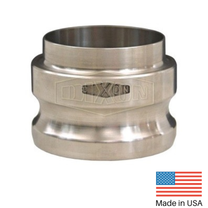 Dixon® Cam and Groove Adapter, Connection Type 1: Fitting, Gender 1: Male, Connection Size 1: 3 in, Connection Type 2: Butt Weld, Connection Size 2: 3 in, 316 Stainless Steel, Dimensions: 3-19/32 in Dia x 2-5/8 in L, For Use With: Tube End