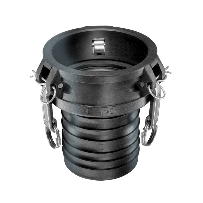 Kuriyama of America Cam and Groove Quick-Acting Coupler, Coupling Fitting, 4 in Connection Size 1, Connection Type 1: Type C, 4 in Connection Size 2, Connection Type 2: Hose Stem, Type C|Hose Stem Connection, Polypropylene, Material Construction: Glass Filled Polypropylene, 50 psi Maximum Operating Pressure, 70 deg F Operating Temperature