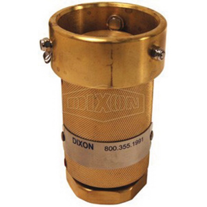 Dixon® Mann Tek Dry Disconnect Hose Unit Coupler, Connection Type 1: Fitting, Gender 1: Female, Connection Size 1: 56 mm, Connection Type 2: NPT, Gender 2: Female, Connection Size 2: 3/4 in, 230 psi, Brass, Dimensions: 113 mm L, For Use With: Composite (Polyeten PE-HD 300) Plug
