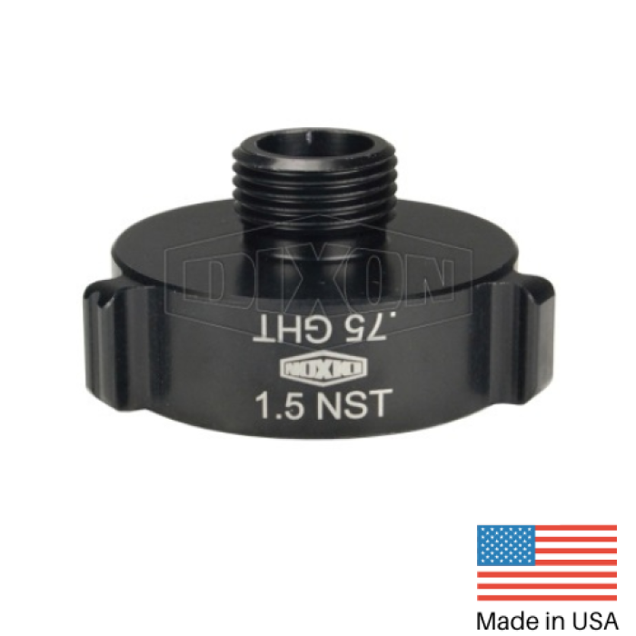 Dixon® Style N37 Rocker Lug Hydrant Adapter, Connection Type 1: NPSH, Gender 1: Female, Connection Size 1: 1-1/2 in, Connection Type 2: GHT, Gender 2: Male, Connection Size 2: 3/4 in, Aluminum, Finish: Anodized/Hard-Coated