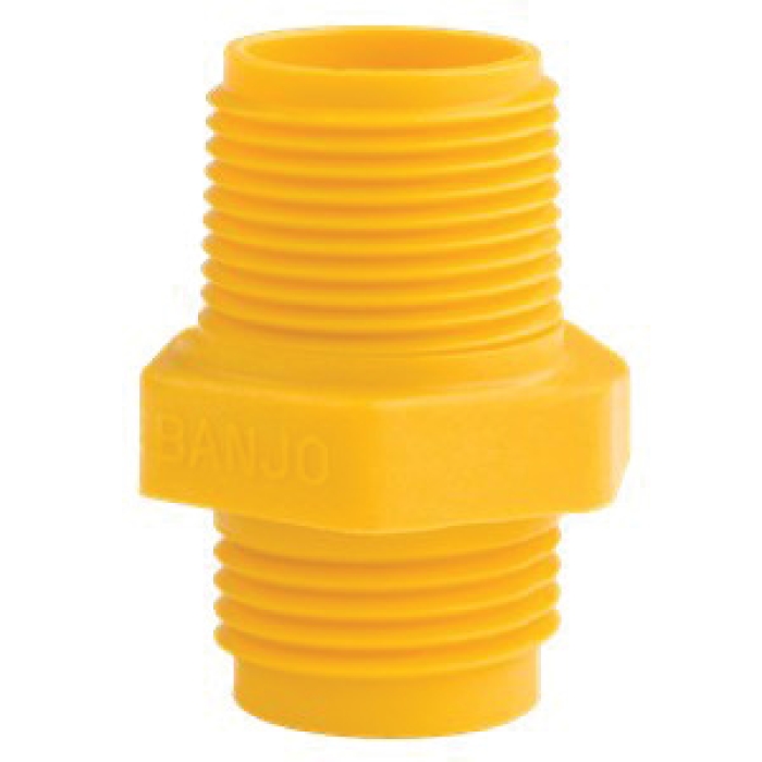 Banjo® Cam Lever Coupling, Connection Type 1: NPT, Gender 1: Male, Connection Size 1: 3/4 in, Connection Type 2: GHT, Gender 2: Male, Connection Size 2: 3/4 in, 300 psi, Fiberglass Reinforced Polypropylene, Yellow, Dimensions: 2 in L x 1-13/32 in W, For Use With: Garden Hose Fitting