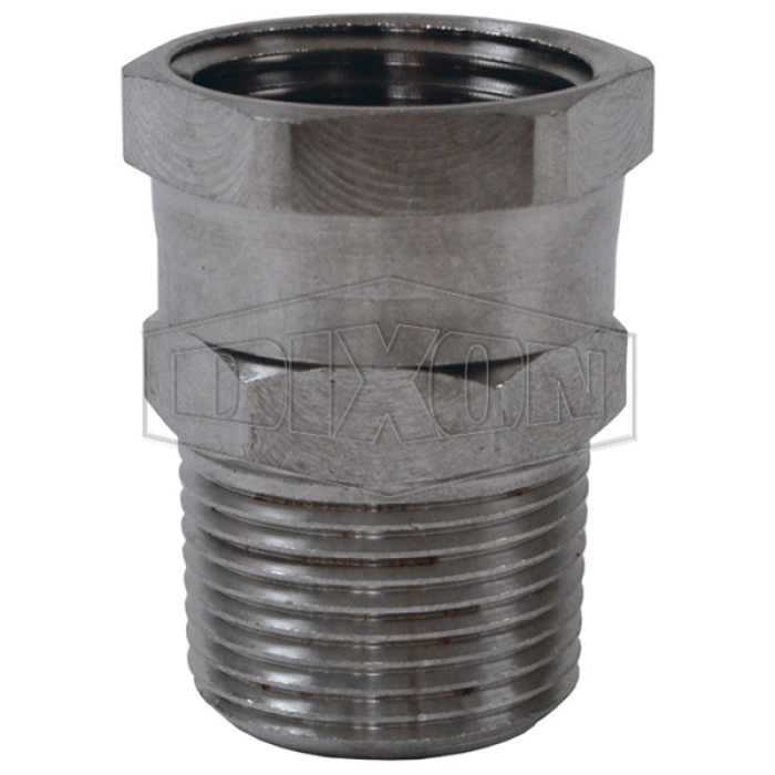 Dixon® Adapter, Connection Type 1: GHT Swivel, Gender 1: Female, Connection Size 1: 3/4 in, Thread Size 1: 3/4-11-1/2, Connection Type 2: NPTF, Gender 2: Male, Connection Size 2: 3/4 in, Thread Size 2: 3/4-14, Hex Size: 1-3/16 in, 303 Stainless Steel, Dimensions: 1.43 in L