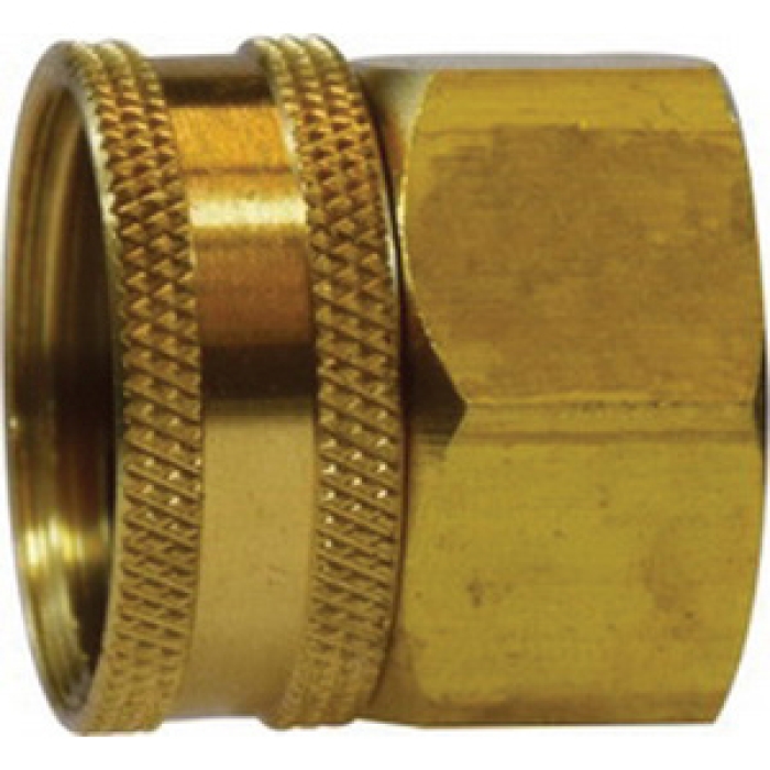Midland Metals Adapter, Connection Type 1: GHT, Gender 1: Female, Connection Size 1: 3/4 in, Connection Type 2: NPTF Swivel, Gender 2: Female, Connection Size 2: 1/2 in, Hex Size: 1 in, 75 psi, Brass, Dimensions: 1.2 in L, 35 - 100 deg F