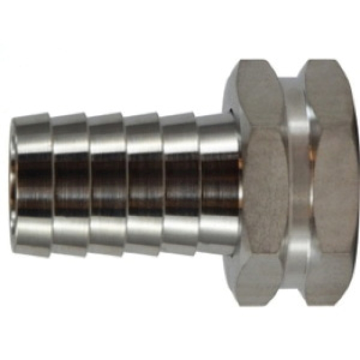 Midland Metals Barstock Coupling, Connection Type 1: Hose Barb, Connection Size 1: 5/8 in, Connection Type 2: GHT Swivel, Gender 2: Female, Connection Size 2: 3/4 in, Hex Size: 1.18 in, 316 Stainless Steel, Dimensions: 1.82 in L