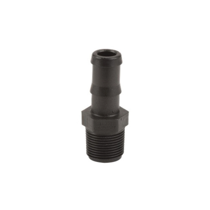 Banjo® Straight Adapter, Connection Type 1: NPT, Gender 1: Male, Connection Size 1: 3/4 in, Thread Size 1: 3/4-14, Connection Type 2: Hose Barb, Gender 2: Male, Connection Size 2: 3/4 in, Hex Size: 1-1/8 in, 300 psi, Polypropylene, Black, Dimensions: 2-29/32 in L, -20 to 150 deg F