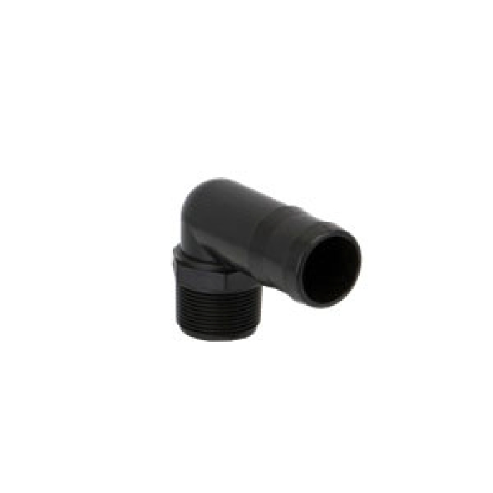 Banjo® 90 deg Elbow, Connection Type 1: NPT, Gender 1: Male, Connection Size 1: 1-1/4 in, Thread Size 1: 1-1/4-11-1/2, Connection Type 2: Hose Barb, Connection Size 2: 1-1/4 in, Hex Size: 1-3/4 in, 300 psi, Glass Reinforced Polypropylene, Black, -20 to 150 deg F