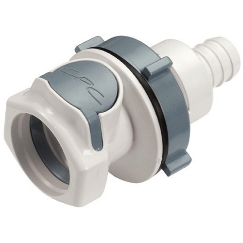 CPC Panel-Mount Non-Valved Coupling Body, Connection Type 1: Hose Barb, Connection Size 1: 1/2 in, 125 psi, Polysulfone, Finish: Molded Gray, White, Dimensions: 2.82 in L x 1.44 in W, -40 to 280 deg F