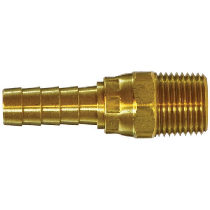 Midland Metals Hose Barb, Connection Type 1: Hose Barb, Connection Size 1: 3/8 in, Connection Type 2: NPTF Swivel, Gender 2: Male, Connection Size 2: 1/4 in, Hex Size: 0.56 in, 150 psi, Brass, For Use With: Hose Clamp, Similar Type Clamp or a Crimped Ferrule, Dimensions: 2.12 in L, -40 to 160 deg F