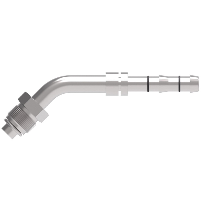 Aeroquip® E-Z Clip System™ 45 deg Elbow, FJ3116 Series, Connection Type 1: Hose, Connection Size 1: 3/8 in, Connection Type 2: O-Ring Short Pilot, Gender 2: Male, Connection Size 2: 3/8 in, Thread Size 2: 5/8-18, Hex Size: 0.62 in, Carbon Steel, Finish: Dura-Kote, For Use With: GH134 Series Hoses, Dimensions: 3.99 in L x 0.62 in W x 0.94 in H