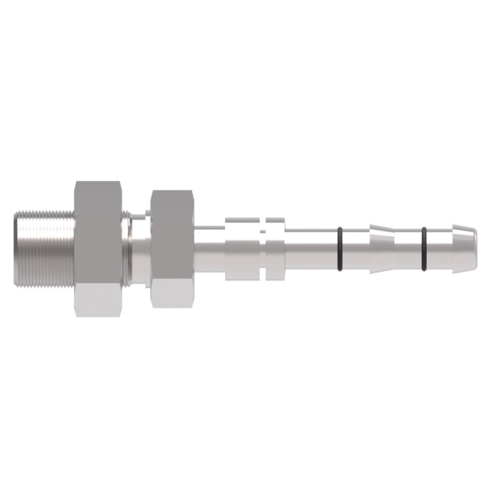 Aeroquip® E-Z Clip System™ Bulkhead Straight Adapter, FJ3513 Series, Connection Type 1: Hose, Connection Size 1: 3/8 in, Connection Type 2: Threaded, Gender 2: Male, Connection Size 2: 3/8 in, Thread Size 2: 5/8-18, Hex Size: 0.9375 x 0.8125 in, Carbon Steel, Finish: Zinc Clear Trivalent Chromate, For Use With: GH134 Series Hoses, Dimensions: 3.69 in L x 0.9375 in W x 0.9375 in H