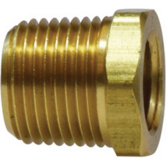 Midland Metals Reducer Hex Bushing, Connection Type 1: NPTF, Gender 1: Male, Connection Size 1: 3/4 in, Thread Size 1: 3/4-14, Connection Type 2: NPTF, Gender 2: Female, Connection Size 2: 3/8 in, Thread Size 2: 3/8-18, Hex Size: 1.06 in, 1200 psi, Brass, Dimensions: 0.94 in L, Dimension Standards: SAE 130140, -65 to 250 deg F, For Use With: Brass, Bronze, Copper, Steel, Aluminum, and Iron Pipe