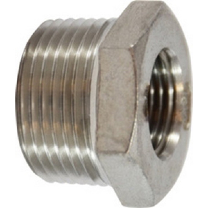 Midland Metals Reducer Hex Bushing, Connection Type 1: NPT, Gender 1: Male, Connection Size 1: 1/2 in, Connection Type 2: NPT, Gender 2: Female, Connection Size 2: 1/4 in, 150 lb, 304 Stainless Steel, Dimension Standards: ASME B1.20.1