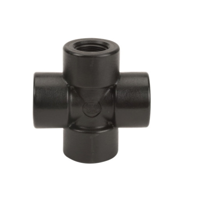 Banjo® Pipe Cross, Connection Type 1: NPT, Gender 1: Female, Connection Size 1: 3/4 in, Thread Size 1: 3/4-14, Connection Type 2: NPT, Gender 2: Female, Connection Size 2: 3/4 in, Thread Size 2: 3/4-14, Connection Type 3: NPT, Gender 3: Female, Connection Size 3: 3/4 in, Thread Size 3: 3/4-14, Connection Type 4: NPT, Gender 4: Female, Connection Size 4: 3/4 in, Thread Size 4: 3/4-14, SCH 80, 300 psi, Glass Reinforced Polypropylene, Black, Dimensions: 3-11/16 in L, -20 to 150 deg F