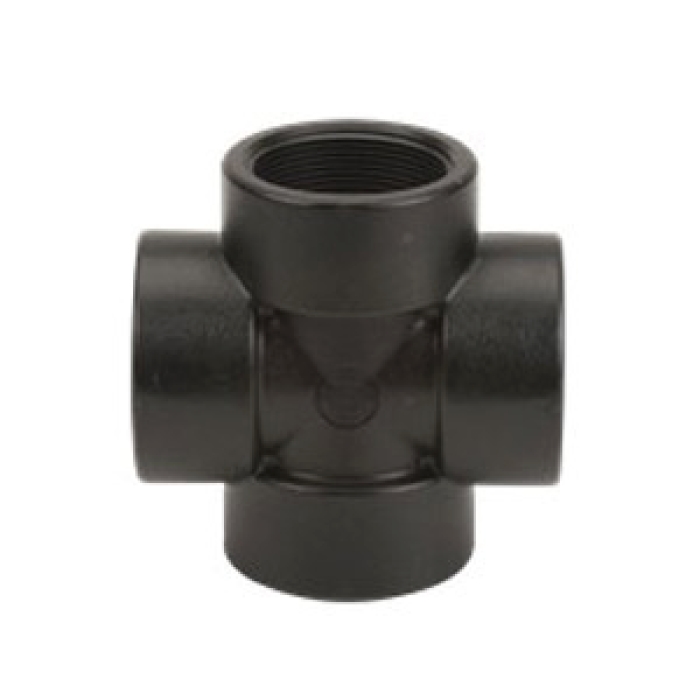 Banjo® Cross, Connection Type 1: NPT, Gender 1: Female, Connection Size 1: 2 in, Connection Type 2: NPT, Gender 2: Female, Connection Size 2: 2 in, Connection Type 3: NPT, Gender 3: Female, Connection Size 3: 2 in, Connection Type 4: NPT, Gender 4: Female, Connection Size 4: 2 in, SCH 80, 300 psi, Glass Reinforced Polypropylene, Black, Dimensions: 5 in L x 5 in W, -20 to 150 deg F