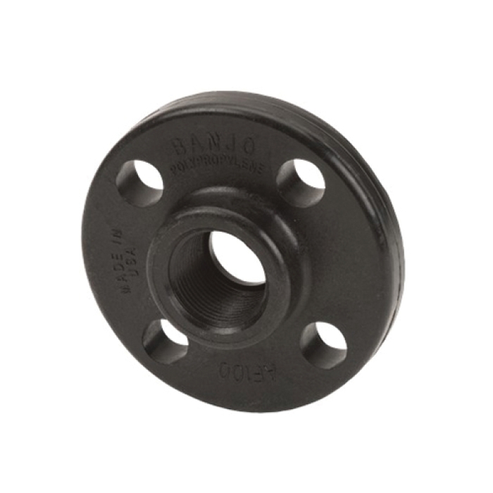 BANJO® Heavy-Duty ANSI Flange, Fitting Type: Flange, Connection Size 1: 1 in, Connection Type 1: FNPT, Material Construction: Glass Reinforced Polypropylene, Black, 5/8 in THK Flange, Number of Bolt Holes: 4, Bolt Hole Diameter: 5/8 in, 150 lb, 4-1/4 in OD, -20 to 150 deg F, Additional Information: SCH 80