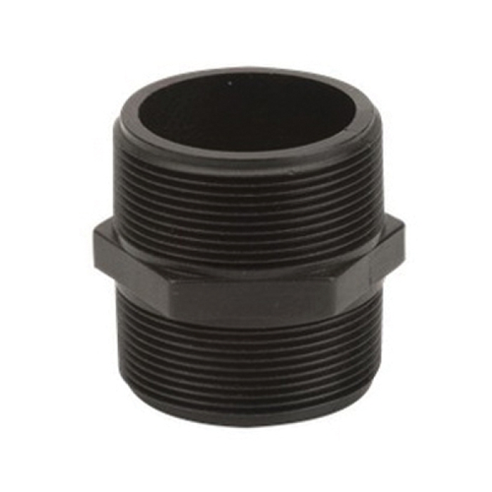 Banjo® Short Hex Nipple, Connection Type 1: NPT, Gender 1: Male, Connection Size 1: 2 in, Connection Type 2: NPT, Gender 2: Male, Connection Size 2: 2 in, SCH 80, 300 psi, Glass Reinforced Polypropylene, Black, 2-3/8 in Diameter, 2-1/2 in Length, -20 to 150 deg F