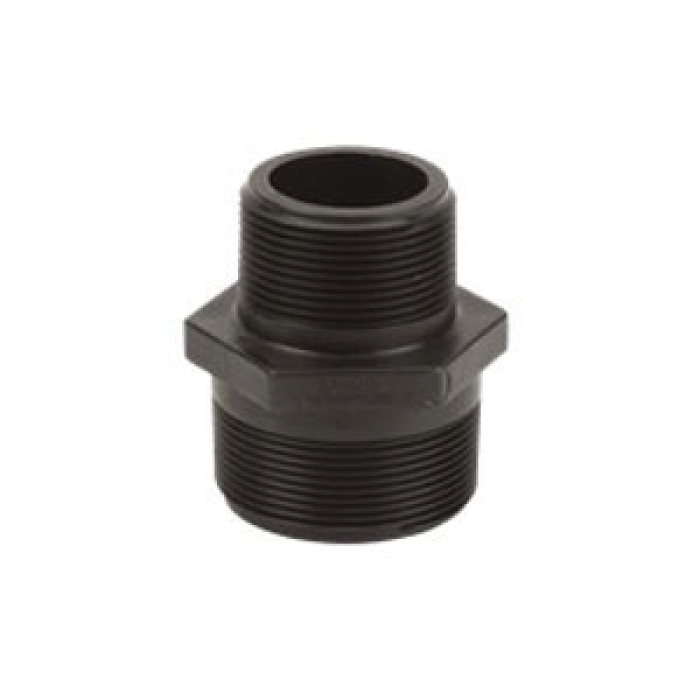 Banjo® Reducing Nipple, Connection Type 1: NPT, Gender 1: Male, Connection Size 1: 2 in, Thread Size 1: 2-11-1/2, Connection Type 2: NPT, Gender 2: Male, Connection Size 2: 1-1/2 in, Thread Size 2: 2-11-1/2, SCH 80, 150 psi at 70 deg F, Glass Reinforced Polypropylene, Black, 2-3/8 x 1-29/32 in Diameter, 2-15/16 in Length, -20 to 150 deg F