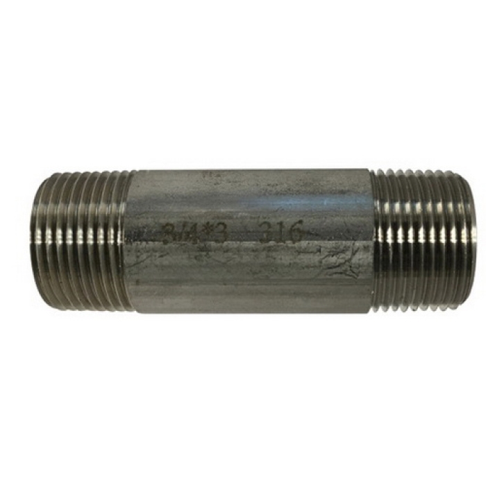 Midland Metals Welded Close Nipple, Connection Type 1: NPT, Gender 1: Male, Connection Size 1: 3/4 in, Thread Size 1: 3/4-14, Connection Type 2: NPT, Gender 2: Male, Connection Size 2: 3/4 in, Thread Size 2: 3/4-14, SCH 40, 304 Stainless Steel, 1-3/8 in Length, Dimension Standards: ANSI B1.20.1