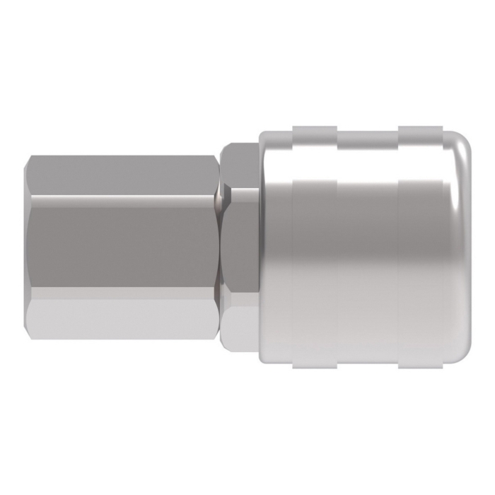 Aeroquip® Coupling, 3000 Series, Connection Type 1: Quick Disconnect, Gender 1: Female, Connection Size 1: 1/4 in, Connection Type 2: NPTF, Gender 2: Female, Connection Size 2: 1/4 in, Thread Size 2: 1/4-18, Hex Size: 0.69 in, 2000 psi, Brass, Dimensions: 2.19 in L x 1.19 in W, Dimension Standards: ISO 6150 Series B, -40 to 250 deg F