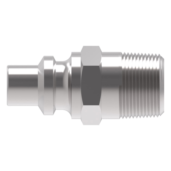 Aeroquip® Coupling Plug, 600 Series, Connection Type 1: Quick Disconnect, Gender 1: Male, Connection Size 1: 1/4 in, Connection Type 2: NPTF, Gender 2: Male, Connection Size 2: 1/4 in, Thread Size 2: 1/4-18, Hex Size: 0.56 in, 1500 psi, Brass, Dimensions: 1.47 in L x 0.65 in W, -40 to 250 deg F