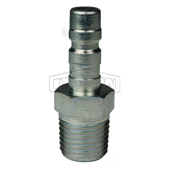 Dixon® Pneumatic Plug, A Series, Connection Type 1: Quick Disconnect, Connection Size 1: 1/4 in, Connection Type 2: NPTF, Gender 2: Male, Connection Size 2: 1/4 in, Thread Size 2: 1/4-18, Hex Size: 9/16 in, 1000 psi, Steel, Finish: Trivalent Chrome-Plated, Dimensions: 0.65 in OD x 1.59 in L