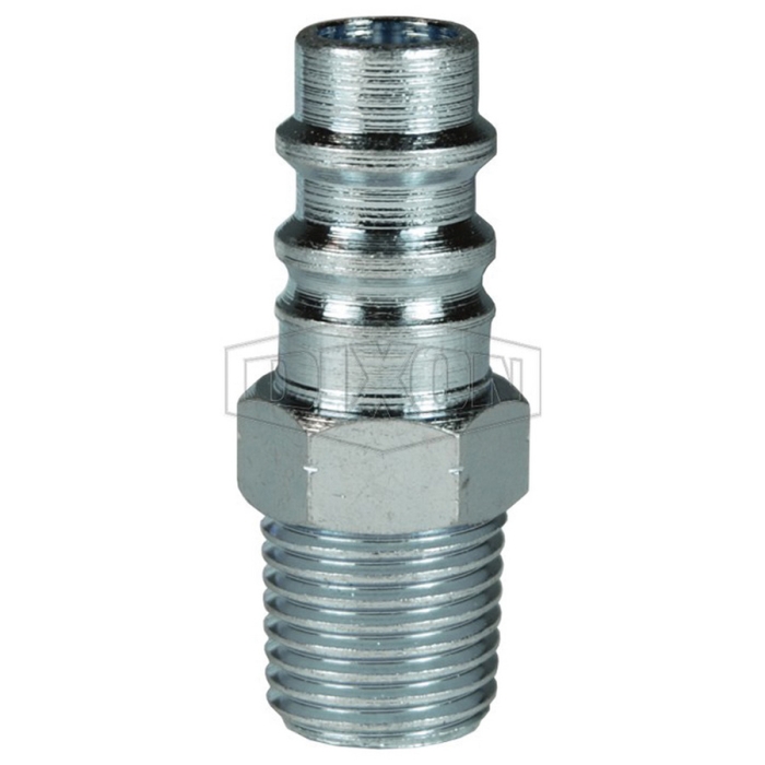 Dixon® Pneumatic Industrial Interchange Plug, CJ Series, Connection Type 1: Quick Disconnect, Connection Size 1: 1/4 in, Connection Type 2: NPT, Gender 2: Male, Connection Size 2: 1/4 in, Thread Size 2: 1/4-18, Hex Size: 9/16 in, Steel, Finish: Trivalent Chrome-Plated, Dimensions: 0.65 in OD x 1.48 in L, -40 to 250 deg F