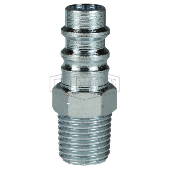 Dixon® Pneumatic Industrial Interchange Plug, CJ Series, Connection Type 1: Quick Disconnect, Connection Size 1: 1/4 in, Connection Type 2: NPT, Gender 2: Male, Connection Size 2: 3/8 in, Thread Size 2: 3/8-18, Hex Size: 11/16 in, Steel, Finish: Trivalent Chrome-Plated, Dimensions: 0.79 in OD x 1.56 in L, -40 to 250 deg F