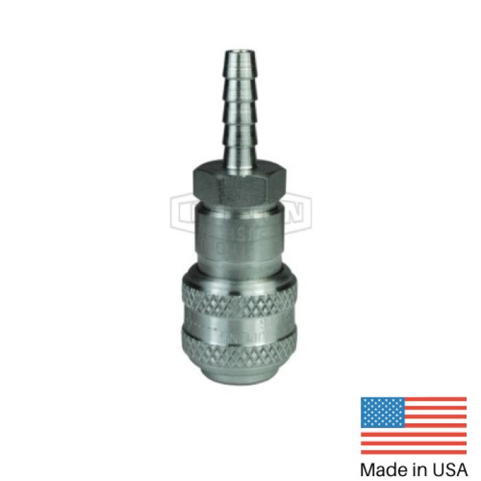 Dixon® Pneumatic Automatic Industrial Interchange Coupler, D Series, Connection Type 1: Quick Disconnect, Connection Size 1: 1/4 in, Connection Type 2: Hose Barb, Connection Size 2: 3/8 in, Hex Size: 11/16 in, 303 Stainless Steel, Dimensions: 0.98 in OD x 2.9 in L, -40 to 250 deg F