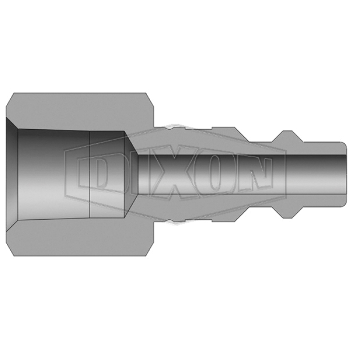 Dixon® Pneumatic Industrial Interchange Plug, DF Series, Connection Type 1: Quick Disconnect, Connection Size 1: 1/4 in, Connection Type 2: NPTF, Gender 2: Female, Connection Size 2: 3/8 in, Thread Size 2: 3/8-18, Hex Size: 7/8 in, 303 Stainless Steel, Dimensions: 1.01 in OD x 1.66 in L, -40 to 250 deg F