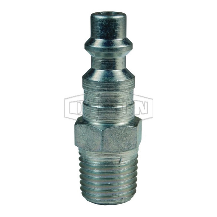 Dixon® Pneumatic Industrial Interchange Plug, DF Series, Connection Type 1: Quick Disconnect, Connection Size 1: 3/8 in, Connection Type 2: NPTF, Gender 2: Male, Connection Size 2: 1/2 in, Thread Size 2: 1/2-14, Hex Size: 7/8 in, Steel, Finish: Trivalent Chrome-Plated, Dimensions: 1.01 in OD x 2.03 in L, -40 to 250 deg F