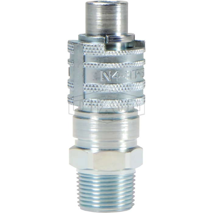 Dixon® Dix-Lock™ Interchange Plug, N Series, Connection Type 1: Quick Disconnect, Gender 1: Male, Connection Size 1: 3/8 in, Connection Type 2: NPTF, Gender 2: Male, Connection Size 2: 1/2 in, Hex Size: 1 in, Steel, Finish: Trivalent Chrome-Plated, Dimensions: 1.13 in OD x 3.36 in L, -40 to 250 deg F