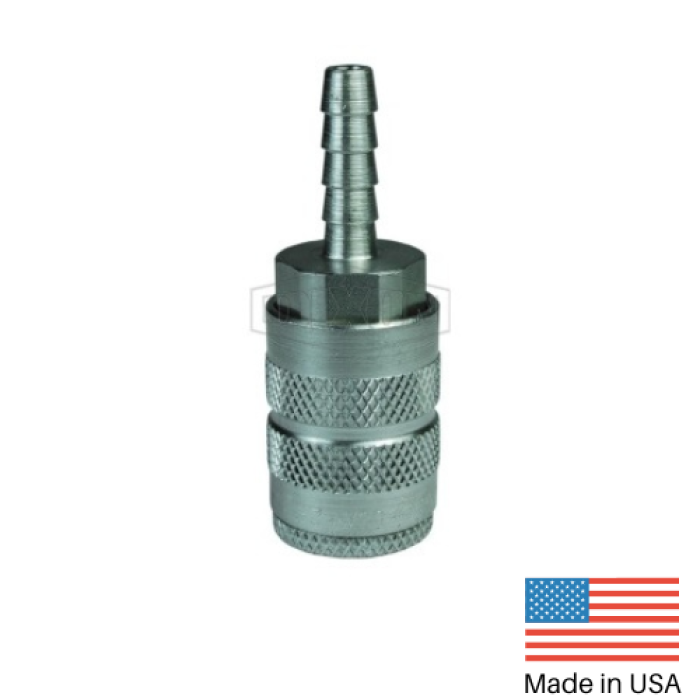 Dixon® Pneumatic Manual Industrial Interchange Coupler, F Series, Connection Type 1: Quick Disconnect, Connection Size 1: 1/4 in, Connection Type 2: Hose Barb, Connection Size 2: 1/4 in, Hex Size: 3/4 in, 500 psi, 303 Stainless Steel, Dimensions: 0.88 in OD x 2.53 in L, -40 to 250 deg F