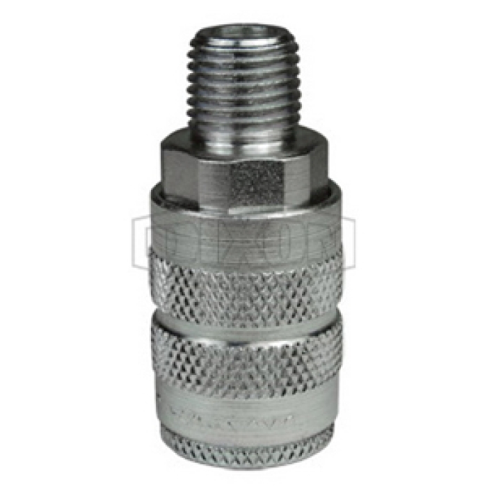 Dixon® Pneumatic Manual Industrial Interchange Coupler, F Series, Connection Type 1: Quick Disconnect, Connection Size 1: 3/8 in, Connection Type 2: NPTF, Gender 2: Male, Connection Size 2: 1/2 in, Thread Size 2: 1/2-14, Hex Size: 7/8 in, 500 psi, Steel, Finish: Trivalent Chrome-Plated, Dimensions: 1.06 in Dia x 2.55 in L, -40 to 250 deg F