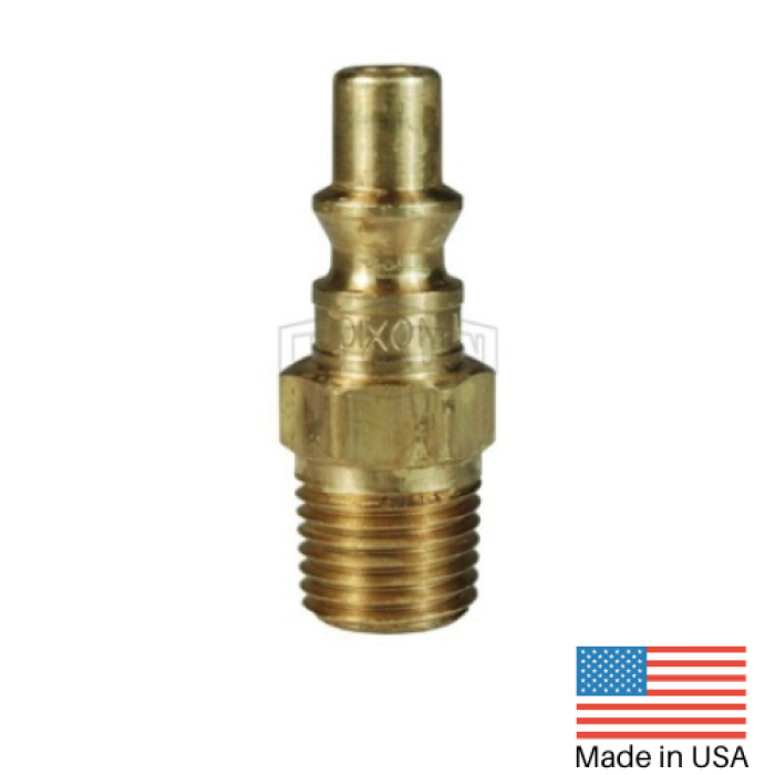 Dixon® ARO Pneumatic Interchange Plug, M Series, Connection Type 1: Quick Disconnect, Connection Size 1: 1/4 in, Connection Type 2: NPTF, Gender 2: Male, Connection Size 2: 1/4 in, Thread Size 2: 1/4-18, Hex Size: 9/16 in, Brass, Dimensions: 0.65 in OD x 1.6 in L, -40 to 250 deg F