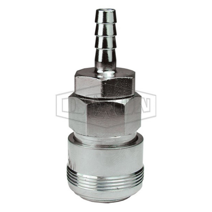 Dixon® Japanese Pneumatic Industrial Interchange Coupler, NK Series, Connection Type 1: Quick Disconnect, Connection Size 1: 1/4 in, Connection Type 2: Hose Barb, Connection Size 2: 1/4 in, Hex Size: 3/4 in, 300 psi, Steel, Finish: Trivalent Chrome-Plated, Dimensions: 1.02 in OD x 2.4 in L, -40 to 250 deg F