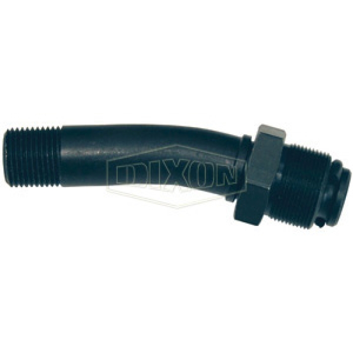 Dixon® Bent Stem Swivel, Connection Type 1: NPT, Gender 1: Male, Connection Size 1: 7/8 in, Thread Size 1: 7/8-24, Connection Type 2: NPT, Gender 2: Male, Connection Size 2: 3/8 in, Hex Size: 1 in, 90 psi, Steel, Dimensions: 3-25/32 in L, For Use With: Chipping Hammers