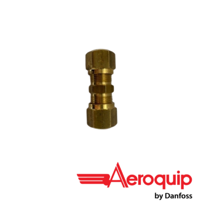 Aeroquip® Straight Union, Connection Type 1: Compression Nylon Tube, Connection Size 1: 1/2 in, Connection Type 2: Compression Nylon Tube, Connection Size 2: 1/2 in, Brass, 1.31 in Stud Length, 150 psi, For Use With: Air Brake Tubing, -40 to 200 deg F, Hex Size: 11/16 in