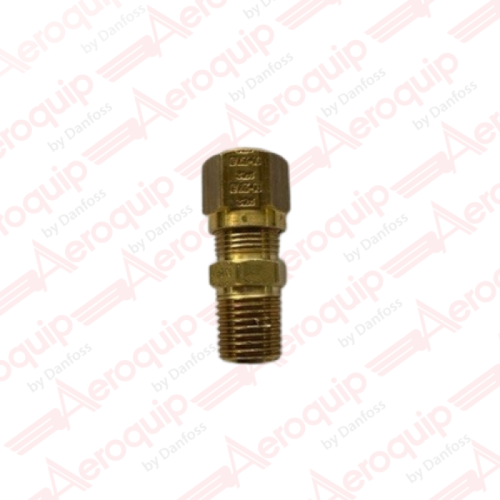 Aeroquip® Straight Air Brake Connector, Connection Type 1: Compression Nylon Tube, Connection Size 1: 3/8 in, Connection Type 2: MPT, Connection Size 2: 1/4-18, Brass, 150 psi, For Use With: Air Brake Tubing, -40 to 200 deg F, Hex Size: 9/16 in
