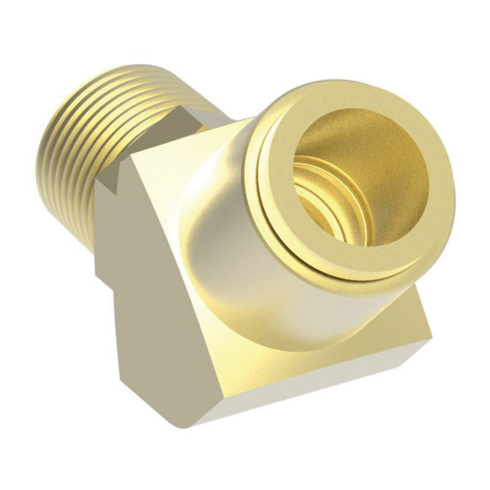 Aeroquip® 45 deg Elbow, 1880x Series, 1.58 in Length, 0.57 in Width, 1.26 in Height, Connection Type 1: Push-to-Connect, Connection Size 1: 1/4 in, Connection Type 2: Male NPTF Swivel, Connection Size 2: 1/4 in, Brass, Hex Size: 9/16 in