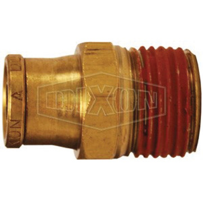 Dixon® Connector, Connection Type 1: Push-to-Connect, Connection Size 1: 1/4 in, Connection Type 2: NPTF, Gender 2: Male, Connection Size 2: 1/4 in, Brass, Dimension Standards: SAE J1131, J2494-1, J2494-3, -40 to 212 deg F, For Use With: SAE J844 Tubing