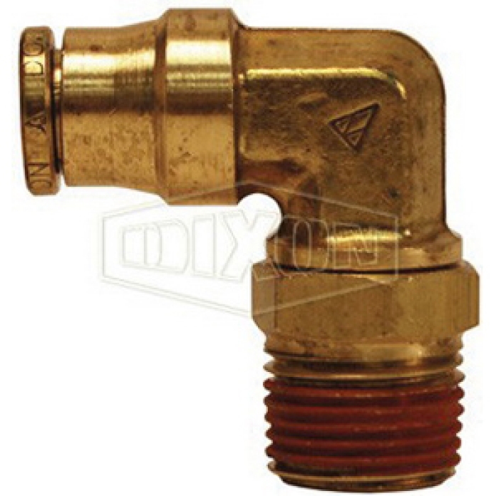 Dixon® Swivel Elbow, Connection Type 1: Push-to-Connect, Connection Size 1: 1/4 in, Connection Type 2: NPTF, Gender 2: Male, Connection Size 2: 1/4 in, Brass, Dimension Standards: SAE J1131, J2494-1, J2494-3, -40 to 212 deg F