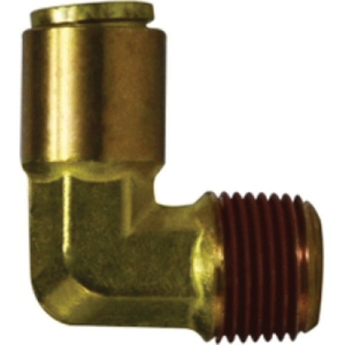 Midland Metals 90 deg Elbow, Connection Type 1: Push-to-Connect, Connection Size 1: 3/8 in, Connection Type 2: NPTF, Gender 2: Male, Connection Size 2: 1/2 in, 150 psi, Brass, Dimension Standards: SAE J1131, -40 to 200 deg F