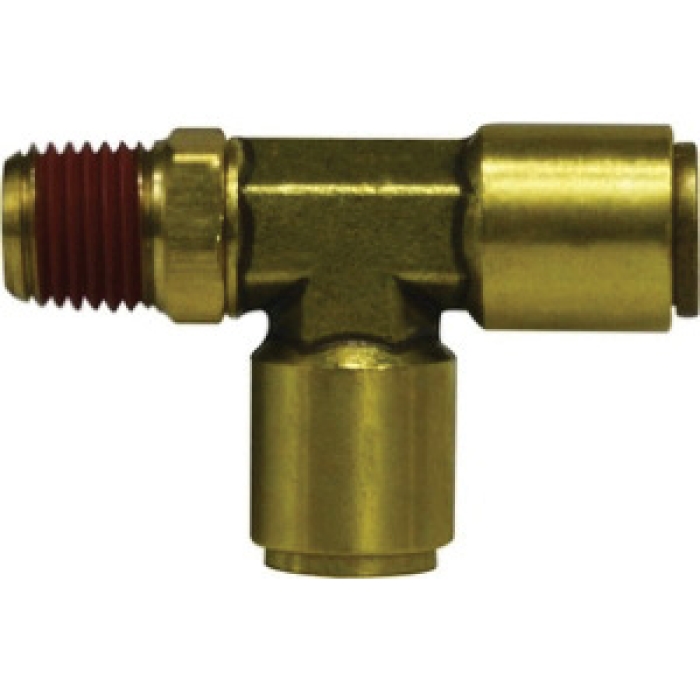 Midland Metals Swivel Run Tee, Connection Type 1: Push-to-Connect, Connection Size 1: 3/8 in, Connection Type 2: Push-to-Connect, Connection Size 2: 3/8 in, Connection Type 3: NPTF Swivel, Gender 3: Male, Connection Size 3: 1/4 in, 150 psi, Brass, Dimension Standards: SAE J1131, -40 to 200 deg F