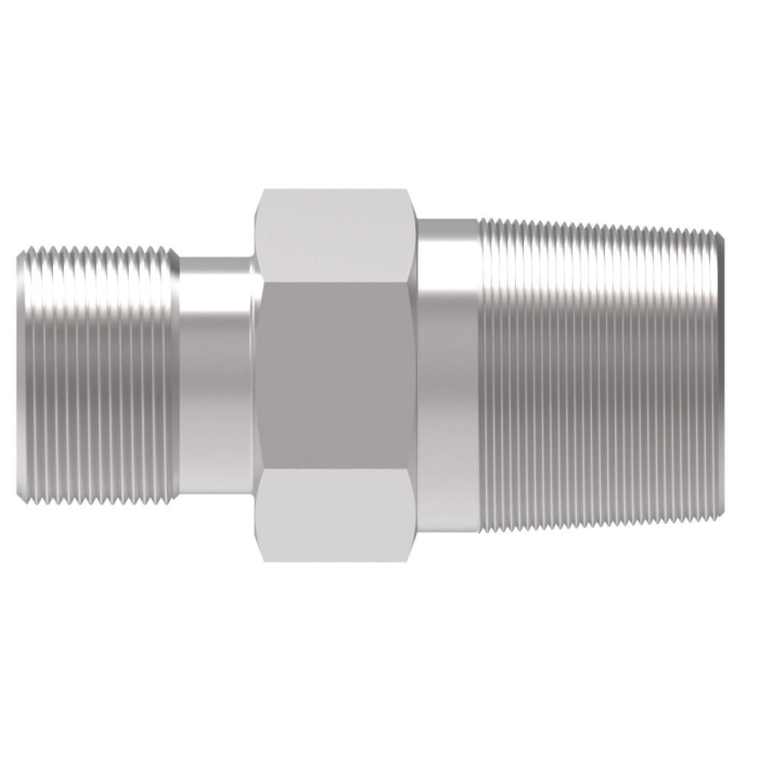 Aeroquip® Ermeto® Straight Connector, 7205x Series, Connection Type 1: Flareless Tube, Gender 1: Male, Connection Size 1: 3/8 in, Connection Type 2: NPTF, Gender 2: Male, Connection Size 2: 1/4 in, Thread Size 2: 1/4-18, Hex Size: 5/8 in, Carbon Steel, Finish: Dura-Kote, Dimensions: 1.59 in L x 0.687 in W x 0.75 in H, Dimension Standards: SAE 080102