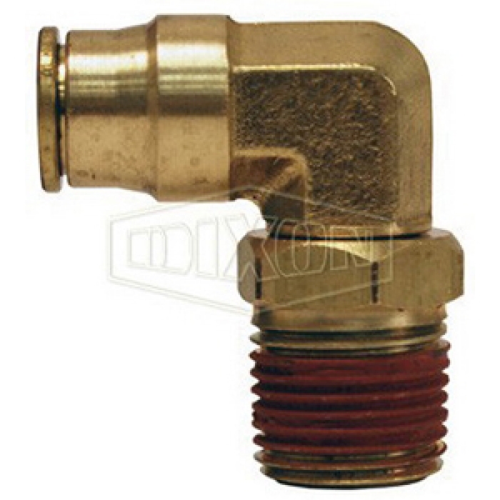 Dixon® Elbow, Connection Type 1: Push-to-Connect, Connection Size 1: 1/4 in, Connection Type 2: NPTF Swivel, Gender 2: Male, Connection Size 2: 1/8 in, Forged Brass, -10 to 200 deg F